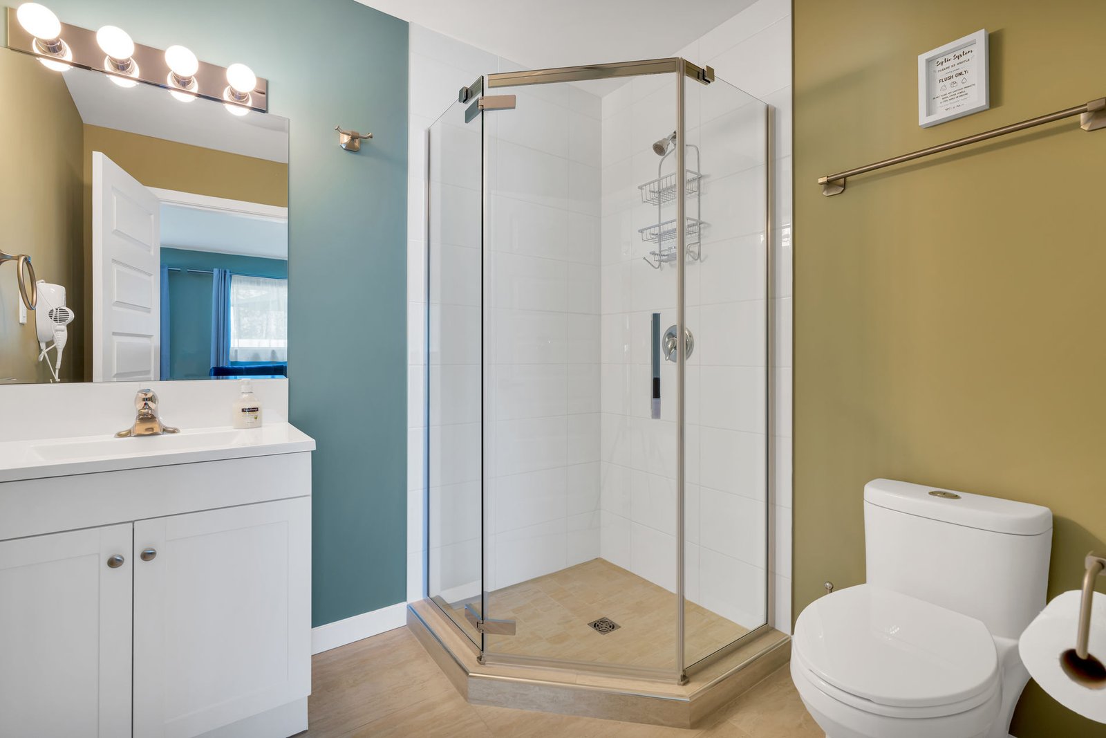 ♦️ Private bathroom with a large mirror, shower, and toilet