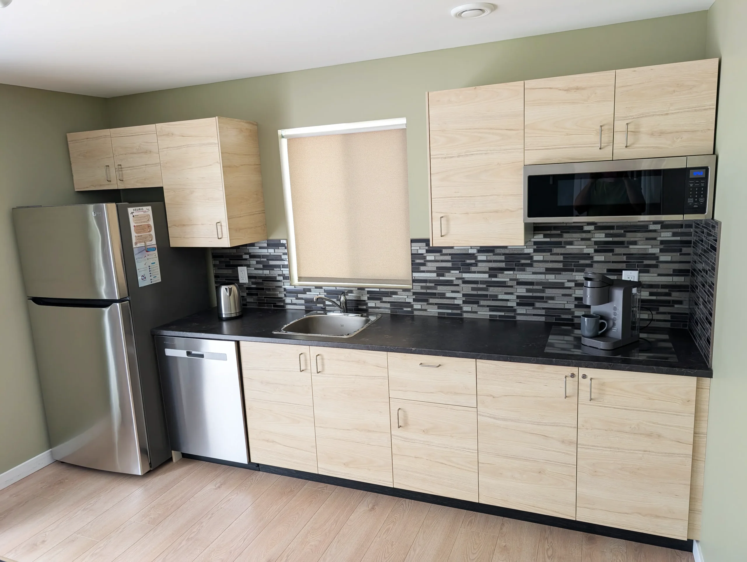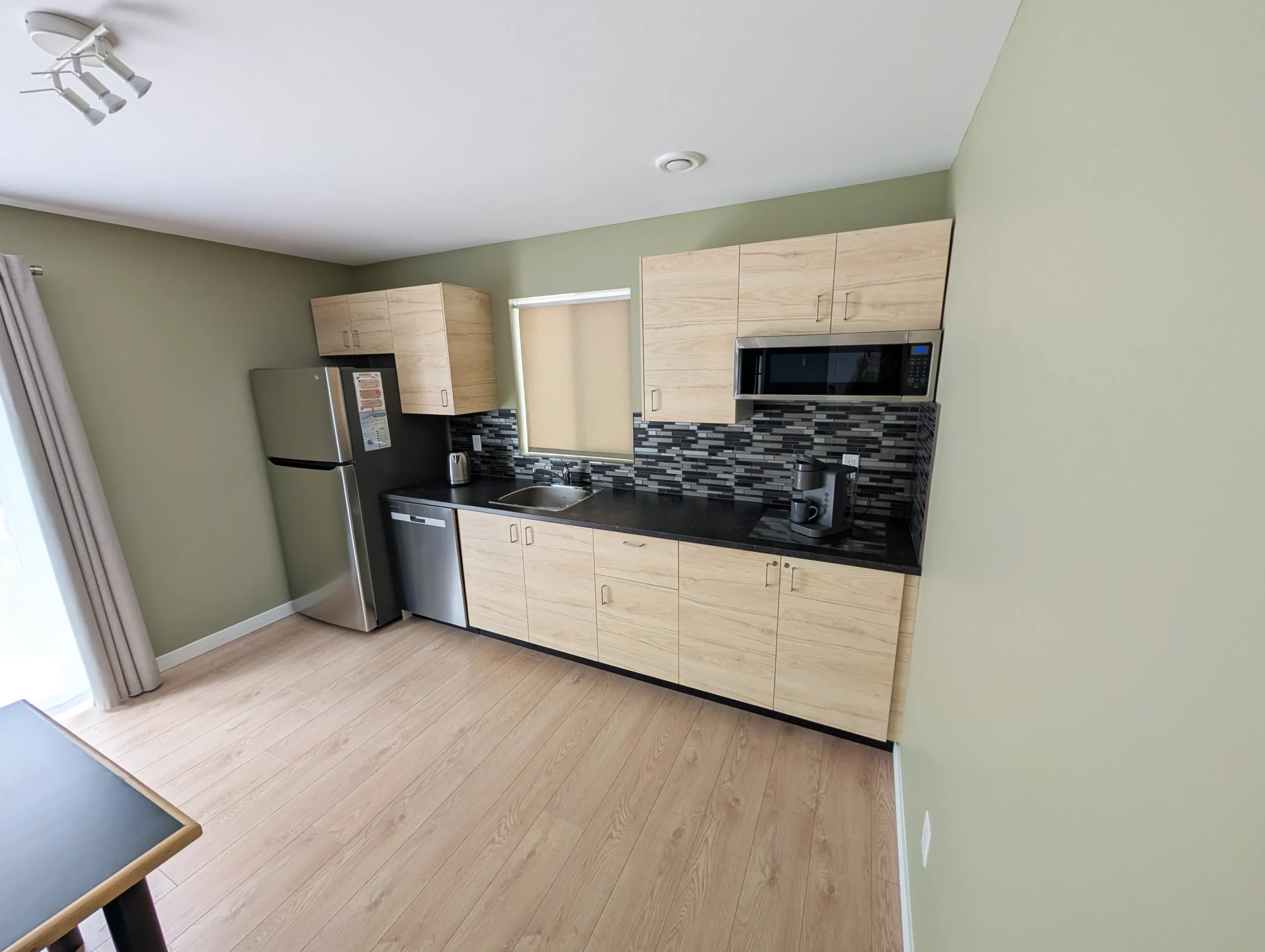 ♦️ A sleek wet bar area includes a fridge, microwave, Keurig coffee maker, sink, and all the essentials for snacks and light refreshments – everything you need for a comfortable stay.